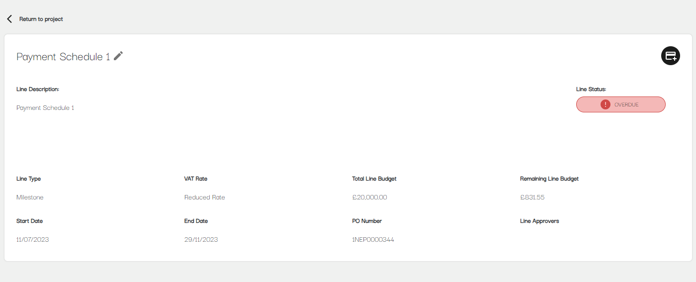 The Line item detail screen will give you full information regarding the project line including the type, budgets, and start/end dates. It will also give a visual indication of the status of the project line.